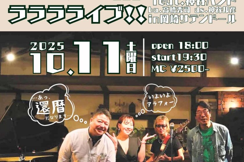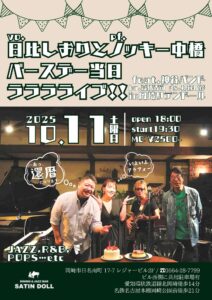 神谷バンド ひびしおり&ノッキー birthday 2500円 10月 11 Sat 2025 ライブ ひびしおり(Vo)、神谷邦彦(Dr)、高橋秀司(Gt)、ノッキー中橋(Pf)・・・2500円 前のスケジュール 次のスケジュール