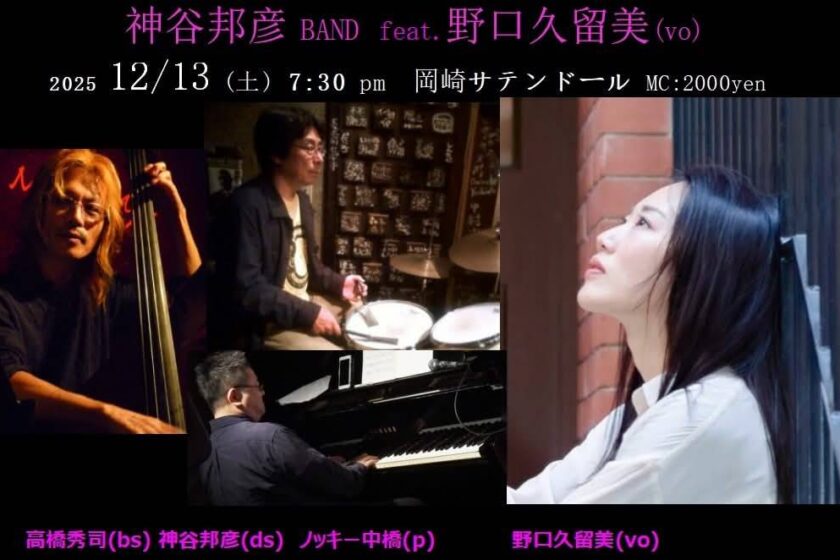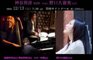 神谷邦彦 BAND feat. 野口久留美(Vo) 2000円 12月 13 Sat 2025 ライブ 神谷邦彦(Dr)、高橋秀司(Gt)、ノッキー中橋(Pf)、野口久留美(Vo)・・・2000円 前のスケジュール 次のスケジュール